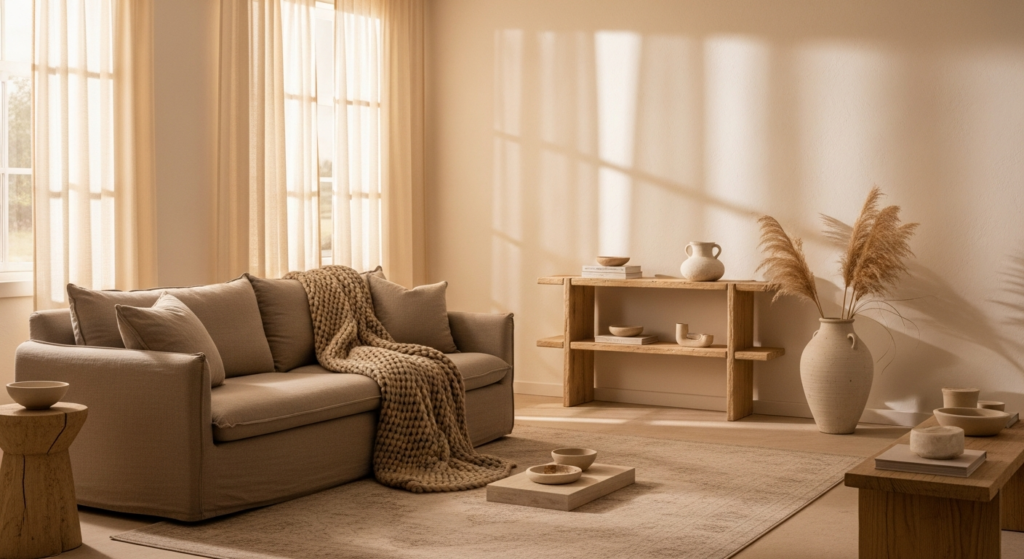 - Introduce depth through tonal variation rather than contrast — layer three to four shades within the same neutral family across walls, textiles, and furniture.