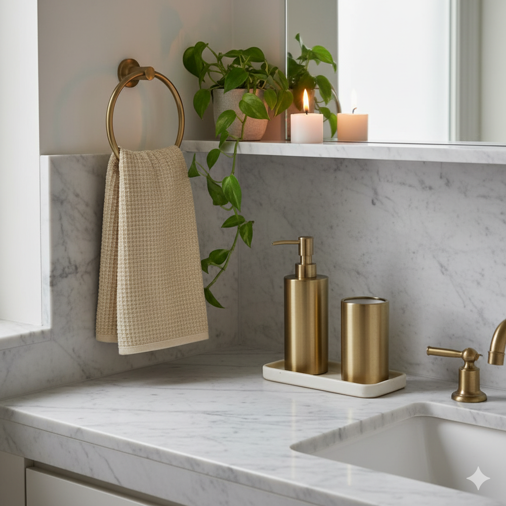 Add a linen hand towel in a neutral, high-quality fabric folded neatly on the vanity, a small plant (pothos, air plants, or bamboo thrive in bathroom humidity), and a single scented candle. These three additions transform a functional bathroom into a daily retreat.