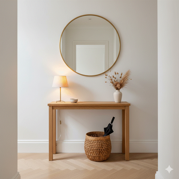 In even the smallest apartment entry, there is room for the essentials of an intentional arrival space: a hook or small rack for keys, a narrow console table or floating shelf for bags and mail, a mirror to check your appearance before leaving, and a small tray or bowl for the daily objects — keys, sunglasses, cards — that would otherwise scatter across every surface in the apartment.