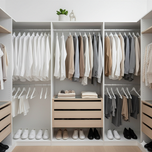 In wardrobes, organise clothing by category and colour within each category — all tops together, ordered light to dark; all trousers together; all dresses in sequence. Install additional hanging rails, shelf dividers, or drawer organisers if the existing storage is insufficient. A wardrobe that functions beautifully makes getting dressed a pleasure rather than a daily exercise in frustration.