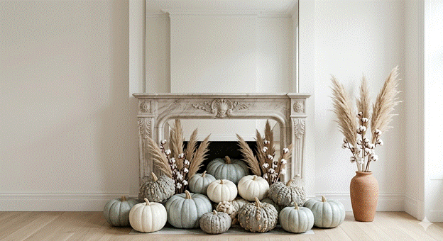 The instinct to incorporate pumpkins and gourds into autumn fireplace decor is entirely correct — these are nature’s most perfectly designed autumn objects, available in an astonishing range of shapes, sizes, colours, and textures. The key to deploying them with sophistication rather than sentimentality lies entirely in restraint and curation.