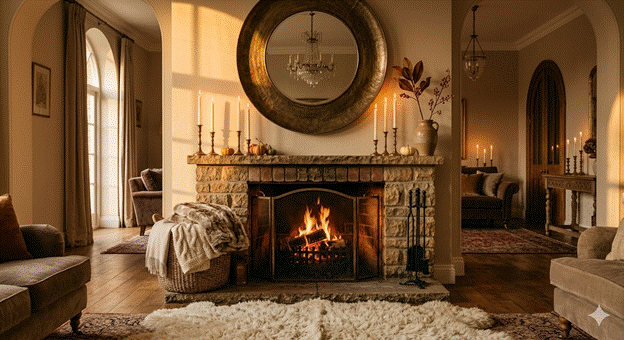 A mirror positioned above the fireplace mantel is one of the most classically beautiful expressions of interior elegance, and in autumn, it acquires a dimension of magic that other seasons cannot offer. A well-placed mantel mirror doubles the depth of the room, reflects the candlelight and firelight, and amplifies the warmth of the seasonal colour palette in a way that feels genuinely cinematic.
