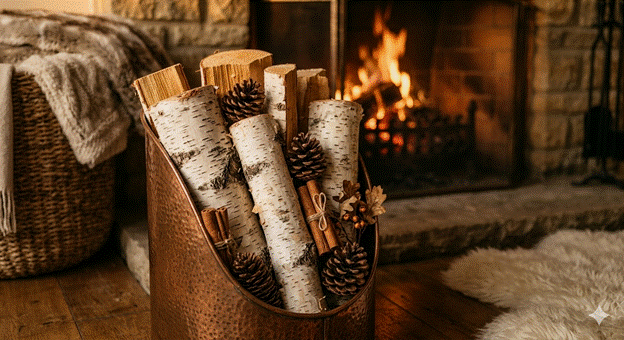 Styling Tip: Choose your firewood with visual intention. Birch logs, with their distinctive white bark and dark horizontal markings, are among the most visually beautiful options available and deserve to be displayed rather than hidden. Stack them with the cut faces outward, intersperse with a few pinecones and dried seed pods, and consider adding a bundle of cinnamon sticks among the logs for a seasonal scent element that is as beautiful as it is fragrant.