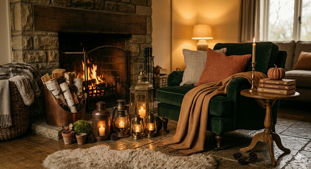 The greatest expression of an autumn fireplace is not simply how it looks, but how it feels to be beside it. A thoughtfully styled fireside reading nook — a chair or low sofa positioned to face the hearth, layered with cushions and a generous throw, accompanied by a small side table holding a candle and a stack of beautiful books — transforms the fireplace from a decorative feature into a destination.