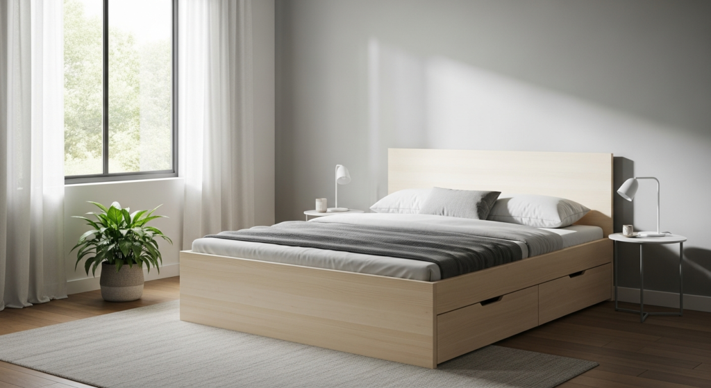 Platform beds or storage beds are ideal as they save space and maintain a clean, uncluttered look.