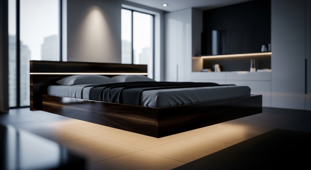 Floating beds appear suspended, adding a sleek and futuristic feel.