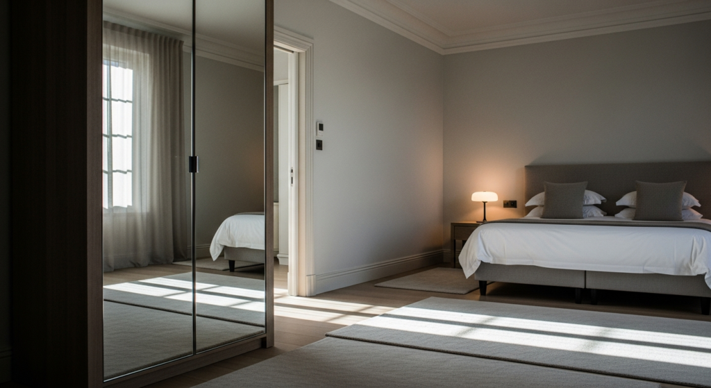 Mirrored doors combine functionality with visual expansion.