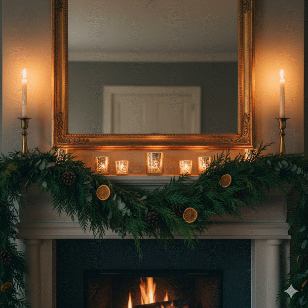 For a timeless, luxurious result, drape a generous garland of fresh or faux cedar and eucalyptus across the mantel shelf, allowing it to cascade naturally at each end. Tuck in dried orange slices, cinnamon sticks, and pinecones for texture and fragrance. Flank the garland with two tall taper candles in aged brass holders and a collection of mercury glass votives that catch and multiply the candlelight.