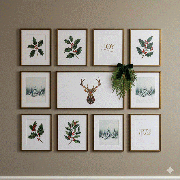 Select three to five prints or artworks with a Christmas or winter theme — botanical illustrations of holly and mistletoe, abstract winter landscapes, typographic prints of seasonal phrases in elegant script — and introduce them into your existing gallery wall arrangement, replacing or supplementing the year-round pieces. Unified by consistent frame finishes in black, brass, or natural wood, they integrate seamlessly into the room.