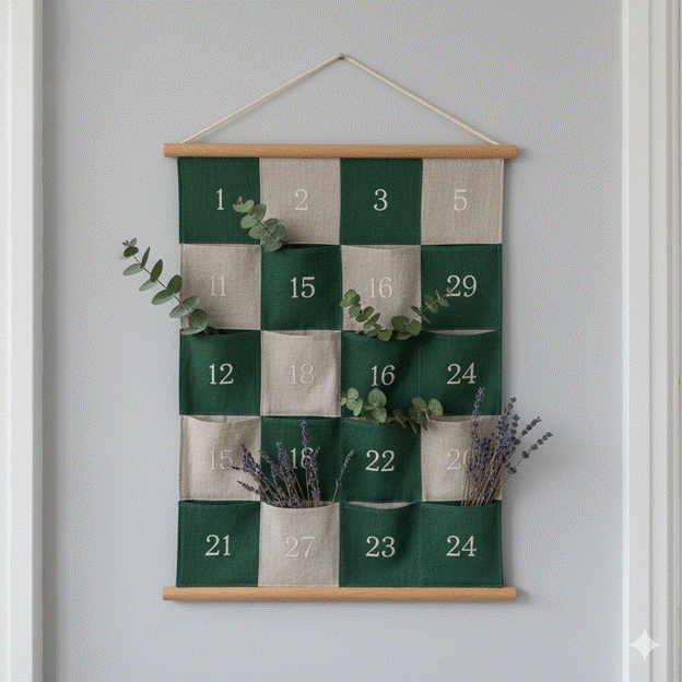 Fabric advent calendars with individual pockets in linen, velvet, or canvas can be hung on the wall as a textile artwork in their own right, their muted, natural tones contributing to rather than competing with the room’s colour scheme. Wooden advent calendars with small drawers or hinged doors bring a crafted, heirloom quality that reads as genuinely designed rather than merely seasonal.