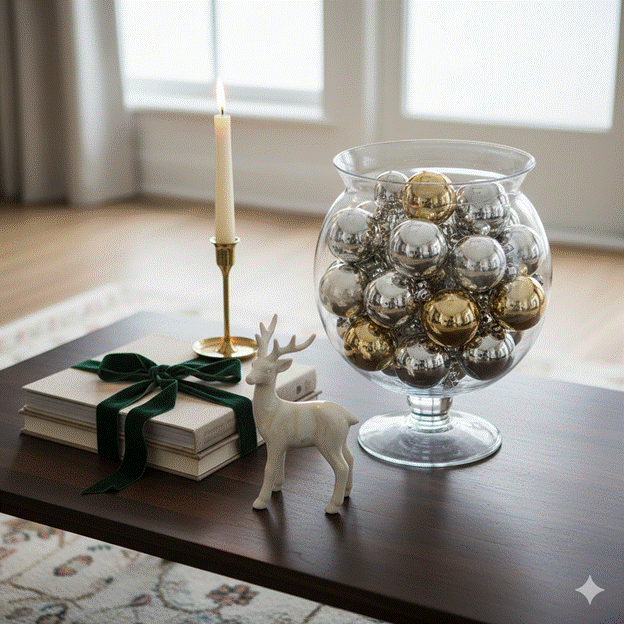 A large glass hurricane vase filled with silver and gold baubles, flanked by a stack of coffee table books tied with a velvet ribbon and a small ceramic deer or woodland figurine, creates a tableau that is sophisticated, seasonal, and entirely personal. Add a single taper candle in a slim brass holder for vertical interest and warm light.