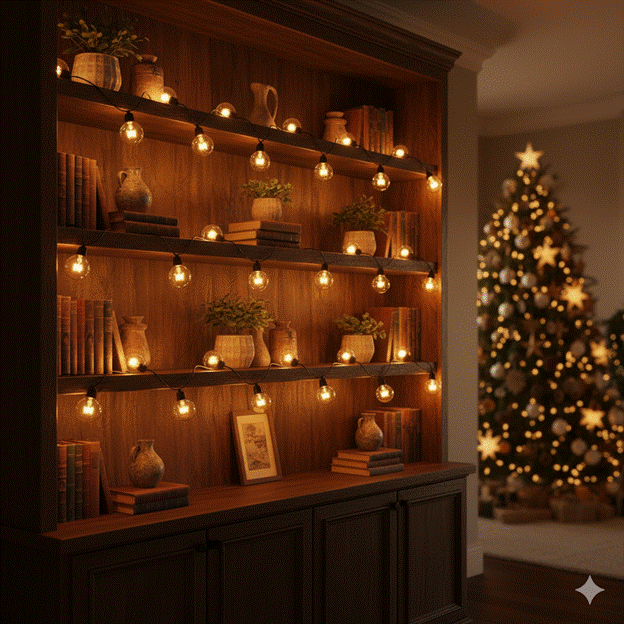 In 2025, the trend is away from uniform, small-bulb string lights and toward a more curated, editorial approach: warm-white Edison globe strings, star-shaped fairy lights, or copper wire micro-lights shaped and placed with intention. The choice of bulb shape and warmth temperature affects the entire mood of the room — warm amber tones (2200K to 2700K) create the most flattering and genuinely festive atmosphere.