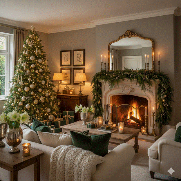 The marks of professional Christmas living room styling are a limited, consistent colour palette, layered lighting at multiple heights, varied textures across every surface, and deliberate restraint — knowing what to leave out as much as what to include. Group objects in odd numbers, vary the heights within every arrangement, ensure every surface has at least one light-reflective element, and tie the room together with repeated botanical greenery that connects the tree, the mantel, and the table arrangements into a single cohesive seasonal narrative.