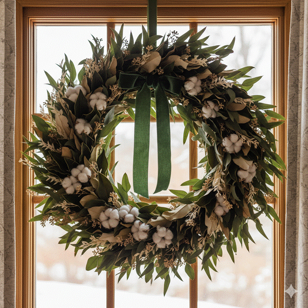 For an interior wreath with genuine design impact, choose or make one that goes beyond the standard holly and baubles. A wreath of dried cotton stems, eucalyptus, preserved magnolia leaves, and a single silk ribbon in forest green or deep burgundy creates a textural composition of real sophistication that will last from December through January.