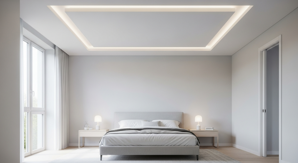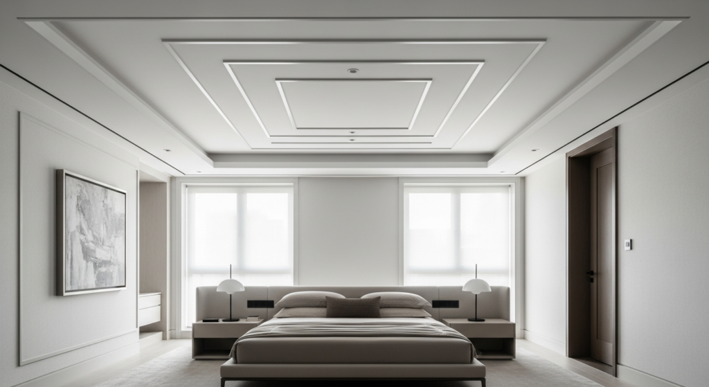 A minimalist false ceiling creates a sleek and uncluttered look, perfect for modern bedrooms. Subtle layering adds dimension without overwhelming the space.