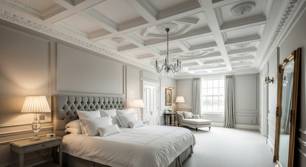 Coffered ceilings bring a classic, grid-like structure that exudes luxury.