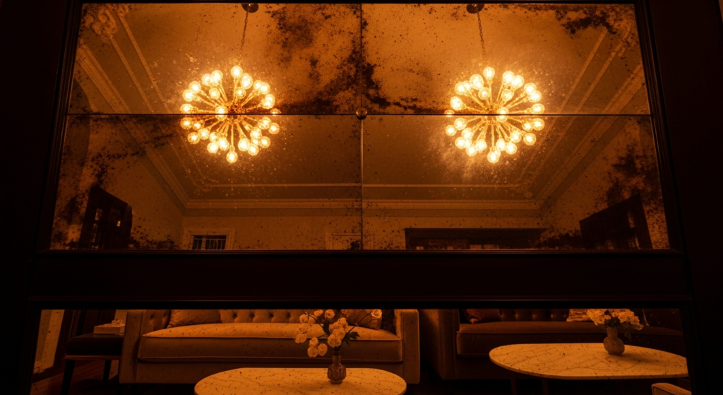 • Antique mirror glass — with its characteristic warm patina, its slight cloudiness, and its softly distorted reflections — creates a far more beautiful and far more appropriate ceiling design result for most residential living rooms than polished mirror, which can feel clinical and overwhelming in a domestic context.