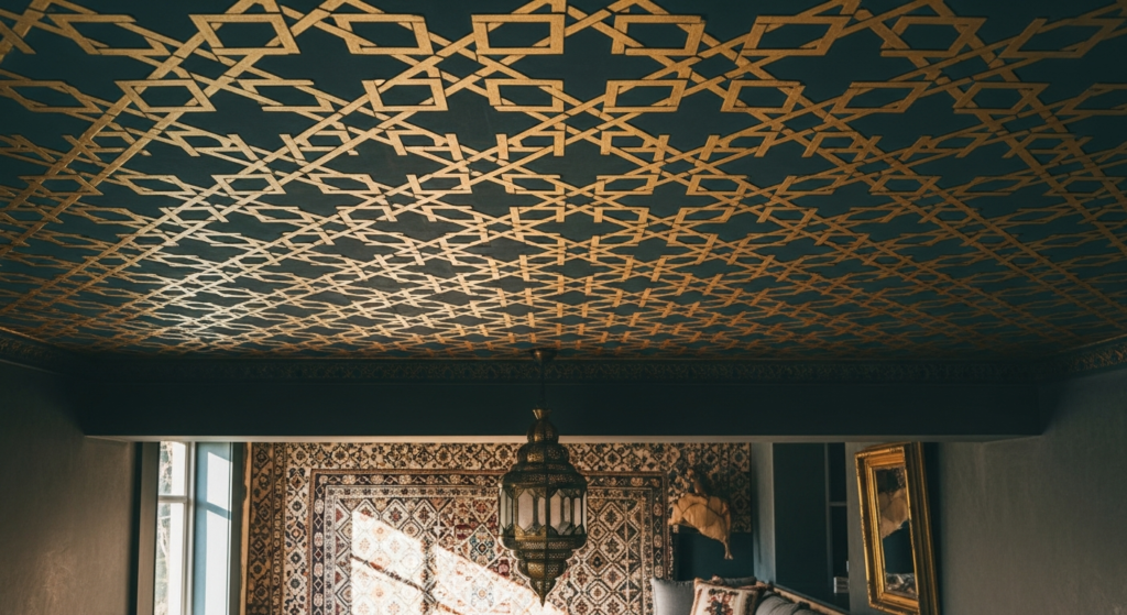• Complete the stenciled ceiling with a complementary pendant light at its center that references the stencil pattern’s cultural or aesthetic origin — a Moroccan lantern above a Moorish geometric stencil, or a simple globe pendant above a botanical repeat — for a ceiling design living room composition of genuine coherence and beauty.