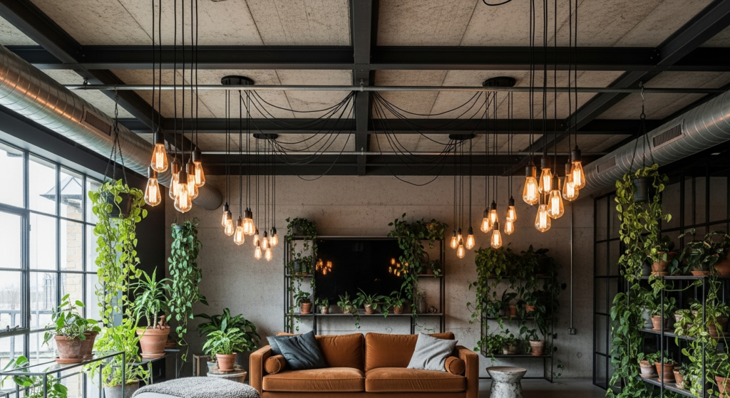 • Warm the industrial ceiling with warm-toned lighting: Edison bulb pendant clusters, track lighting in matte black or brushed brass, and floor lamps create a quality of amber warmth that counteracts the inherent coolness of concrete and steel beautifully.