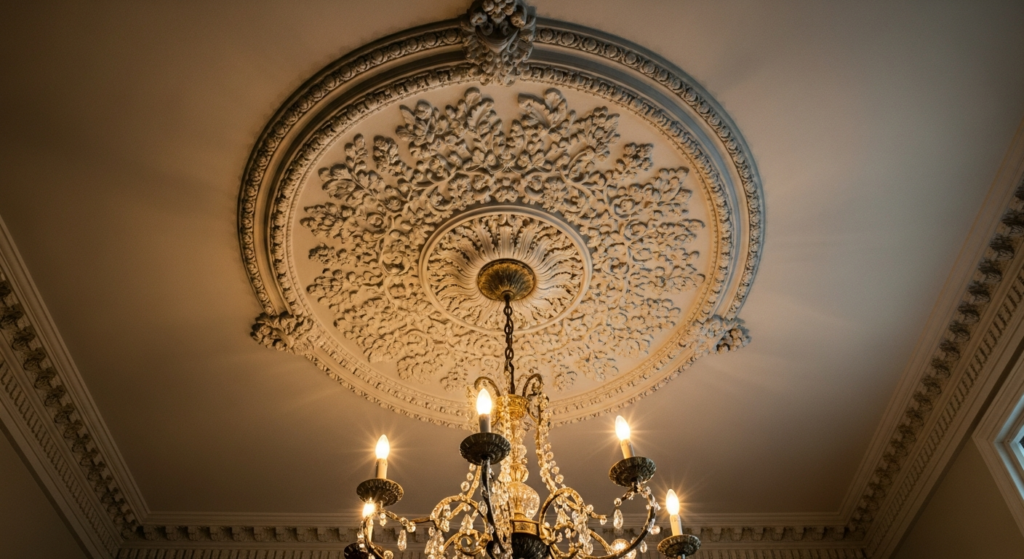 The plaster ceiling medallion — a circular ornamental plasterwork piece installed around the base of a ceiling light fitting — is one of interior design’s most enduringly beautiful and most timeless ceiling design living room details, capable of adding a quality of classical refinement and decorative richness to even the most contemporary and minimally styled space.