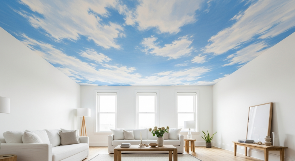 • Keep the living room’s walls and furnishings in simple, restrained tones when installing a sky ceiling mural — the ceiling is the room’s entire statement, and everything below it should function as the quiet, calm setting from which the extraordinary overhead view can be fully appreciated.