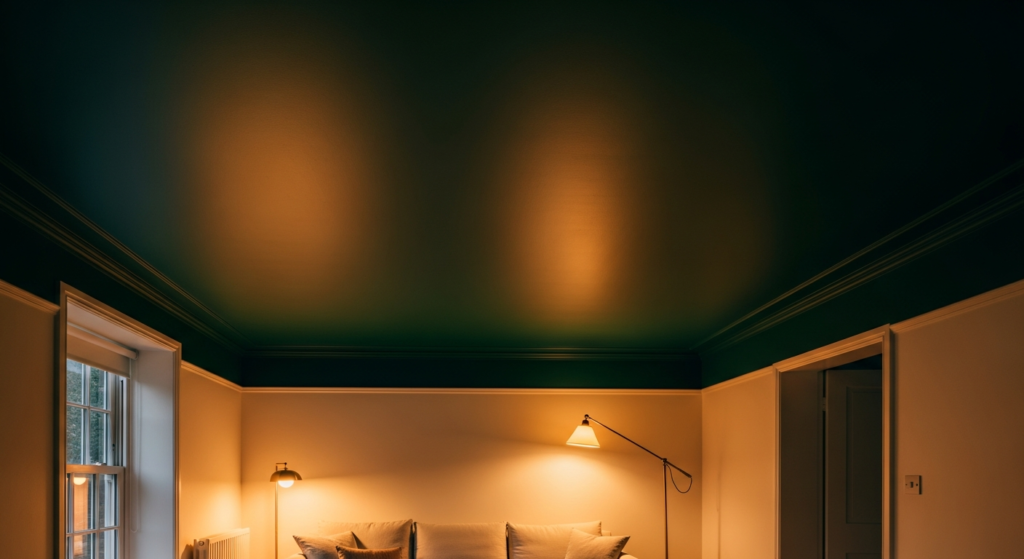 • Alternatively, paint the ceiling a tone two shades deeper than the wall color within the same palette family — this creates a sophisticated tonal ceiling effect that adds depth and drama without the full commitment of a completely contrasting color.