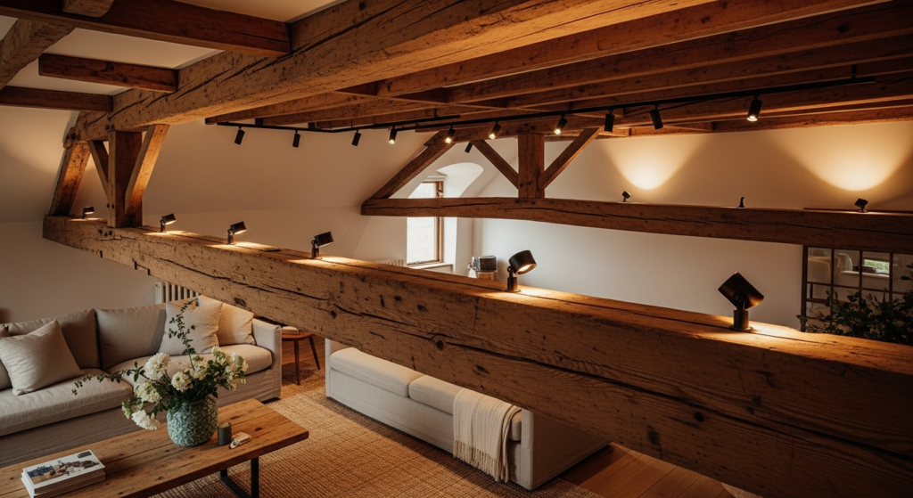 • Complement exposed beams with warm, directional lighting installed between them: recessed spots or track lighting mounted between beam runs illuminate the beam structure from below, creating dramatic sculptural shadows that make the ceiling design a feature at every hour of the day.