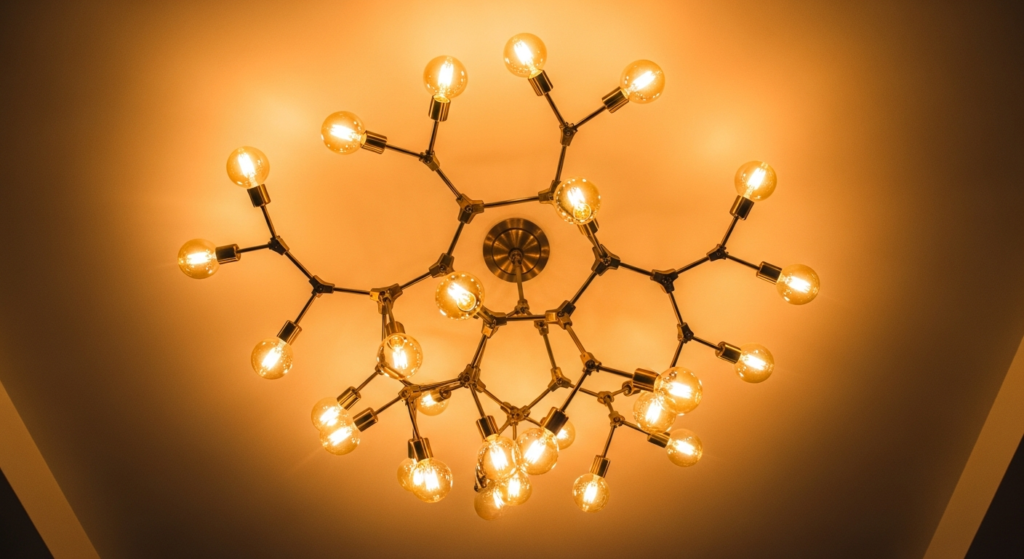 • Always wire a statement chandelier to a dimmer switch — the ability to adjust the chandelier’s light level from bright morning illumination to intimate evening atmosphere is the single most important functional upgrade available to any ceiling design lighting scheme.