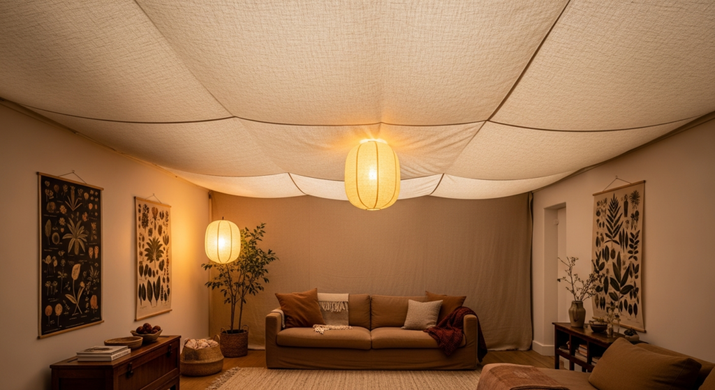 7. Stretched Fabric Ceiling — Soft, Textural, and Completely Unexpected
