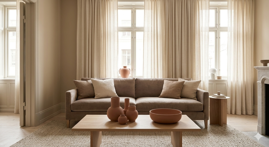 Curtains in linen, cotton, or velvet diffuse natural light and contribute to a warm, comfortable atmosphere.