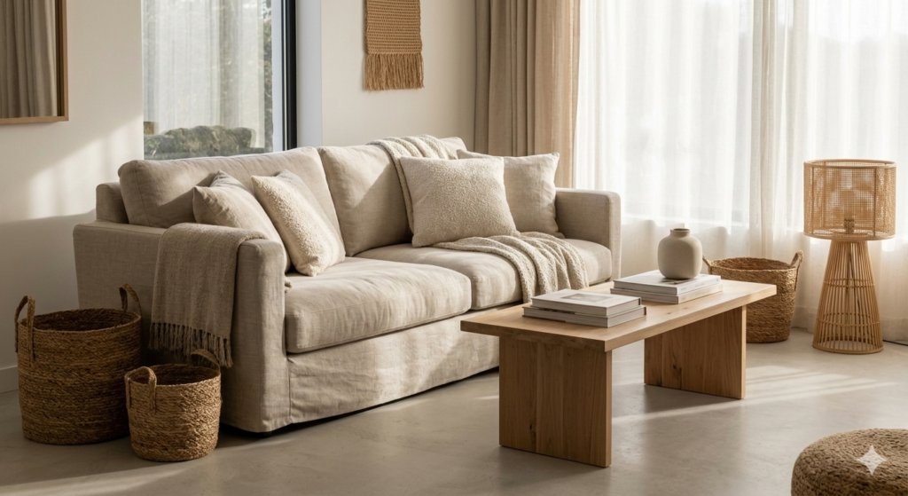 Include a wooden coffee table, rattan baskets, or a jute rug to add subtle natural warmth.