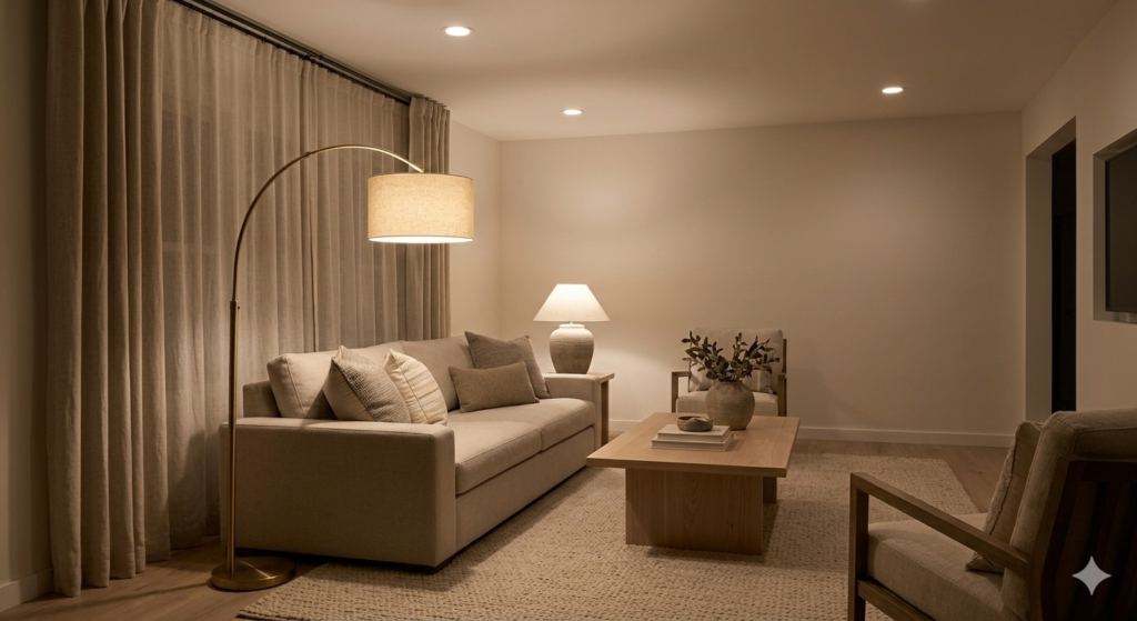 Layered lighting—from overhead lights to table lamps and floor lamps—creates a soft, inviting glow in your living room.