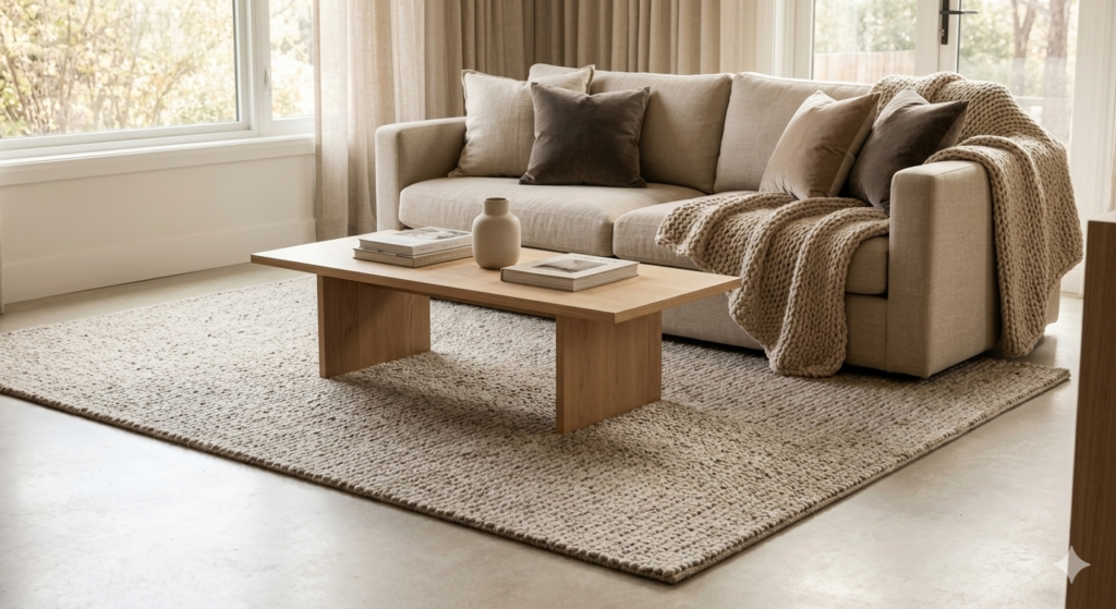 Area rugs anchor furniture while introducing softness underfoot. Rugs with thick pile or woven textures add warmth and visual interest.
