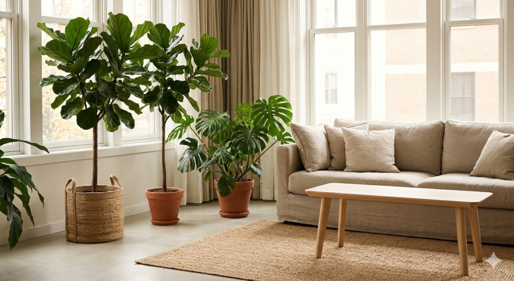 Use a mix of medium and tall indoor plants in ceramic or woven planters to maintain organic harmony.