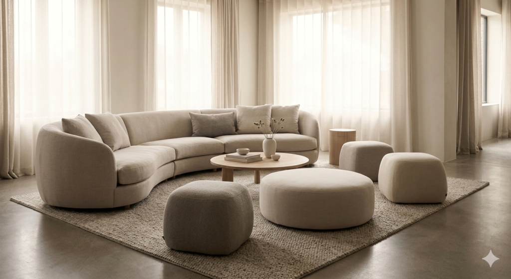Soft, rounded furniture shapes create an approachable and relaxed vibe. Curved sofas, ottomans, and poufs encourage lounging.
