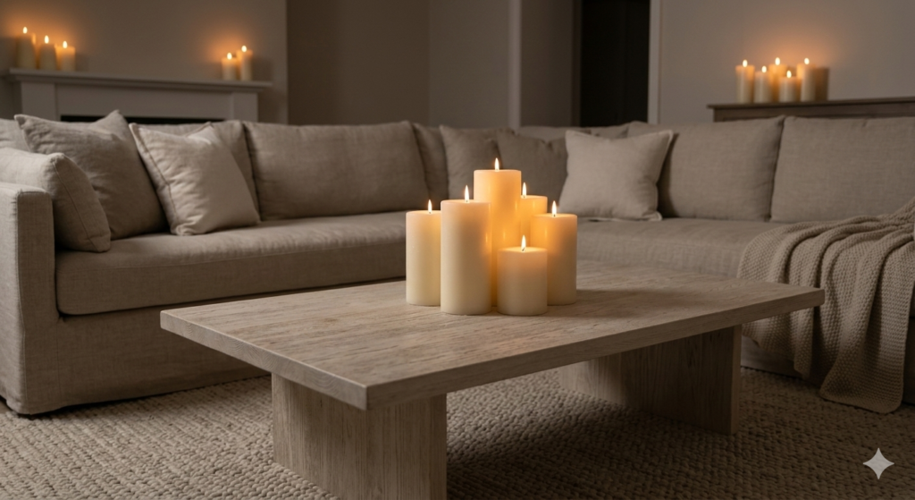 Yes, candles and soft lighting create warmth and a relaxed ambiance, essential for a cozy living room.