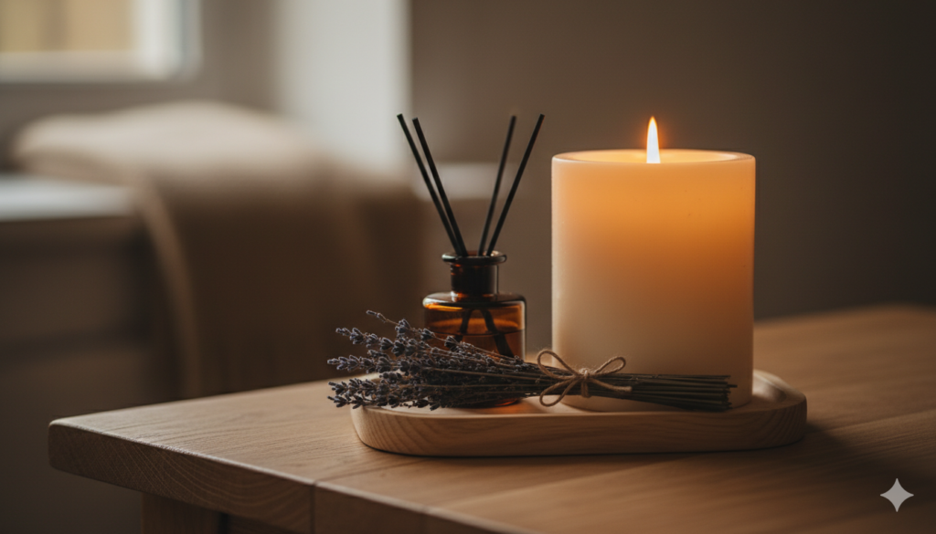 Styling Tip: Choose one signature scent for each room and use it consistently — allowing the olfactory memory of the space to build over time into a specific, personally resonant sensory identity. A bedroom that always smells of lavender and sandalwood; a living room with the consistent warm note of cedarwood and vanilla; a study with the particular quality of old books and fresh coffee — each creates an olfactory environment that makes returning to the room a complete sensory experience rather than merely a visual one. Position scent sources — candles, diffusers, dried botanical bundles — at the room’s primary gathering points: on the coffee table, on the bedside table, on the reading chair side table.