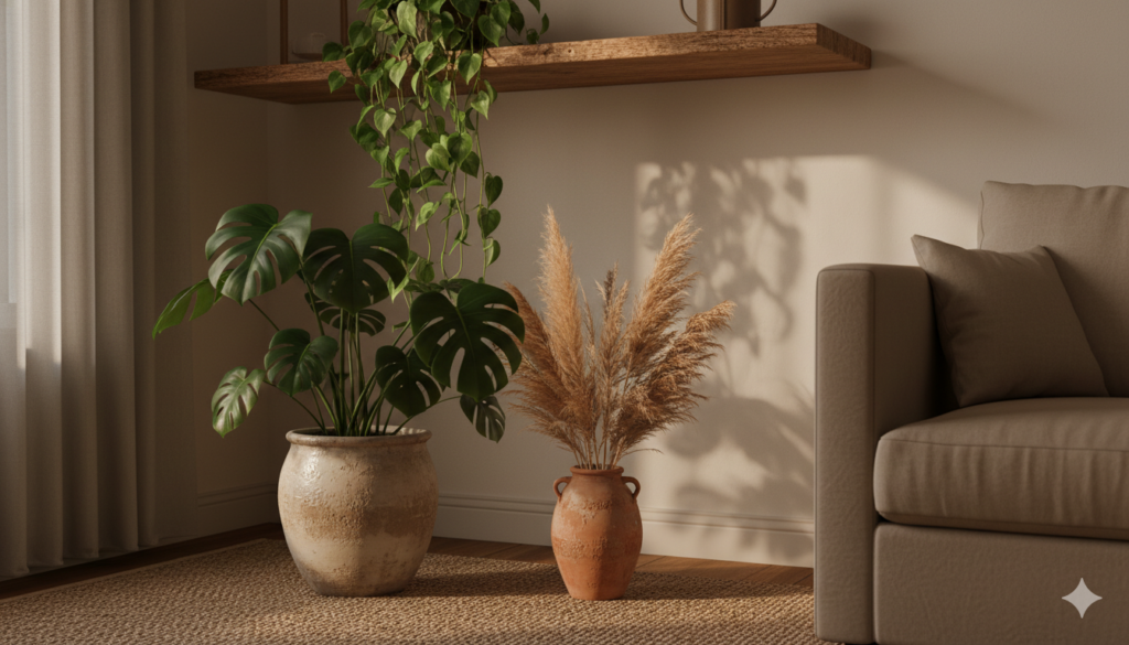 For cozy room decor purposes, the most effective plant choices are those that create a specific quality of enveloping, natural warmth in their immediate environment: a large trailing Pothos that cascades from a high shelf, creating a curtain of green that softens the room’s upper register; a Monstera with its dramatic, sculptural leaves that add organic energy to a corner; a collection of small succulents and cacti in terracotta pots on a windowsill that catch the morning light; or a statement olive tree in a large woven basket that brings a Mediteranean quality of warmth and organic ease.