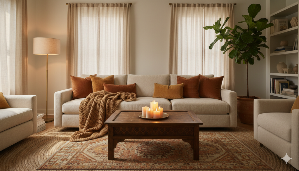 A successful cozy room decor throw and cushion layer works through variety of texture and coherence of palette rather than through variety of pattern. A chunky boucle cushion beside a smooth linen one beside a velvet accent cushion — all within the same warm neutral family of ivory, camel, and warm oat — creates a composition of tactile and visual richness that is deeply cozy without becoming visually busy. The throw should be heavyweight, genuinely warm, and draped rather than folded — a single casual fold or a natural drape over one sofa arm creates the most inviting, most lived-in quality.