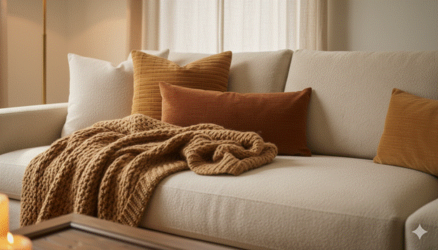 Styling Tip: The most convincing and most cozy cushion composition for a three-seater sofa uses five cushions in three sizes: two large 60x60cm cushions at the back, two medium 50x50cm in front of them, and one longer lumbar cushion at the centre front. All five should be in the same warm neutral colour family with textural variety between each — one boucle, one linen, one velvet, one knit, one plain smooth cotton. The lumbar cushion, positioned slightly off-centre, creates the asymmetric, lived-in quality that a perfectly symmetrical arrangement lacks. Throw the throw loosely over one corner of the sofa rather than folding it precisely.