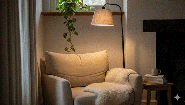 Styling Tip: The single most impactful cozy lighting upgrade available for any existing room is the addition of one quality table lamp on each side of the primary seating arrangement — two matching lamps with warm-toned shades in a quality fabric or ceramic, positioned at sofa-arm height, create an immediate and significant improvement in the room’s warm, intimate quality. Choose shades in a warm fabric — natural linen, a warm shade cloth, or a soft cotton — that diffuse the light gently rather than directing it sharply. All bulbs in the room should be 2700K warm white LED at maximum — cooler bulbs fundamentally compromise the cozy quality regardless of every other lighting decision made in the space.