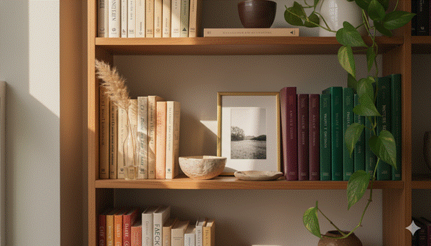 Books as cozy room decor elements are most beautiful when displayed with the same curation applied to any other shelf object — grouped by colour or tone rather than strictly by subject, with some books standing vertically and some lying horizontally to create varied height profiles, with decorative objects and plants interspersed to prevent the visual uniformity of an entirely book-filled shelf. The mix of books and objects creates a shelf composition of genuine personal warmth and visual interest.