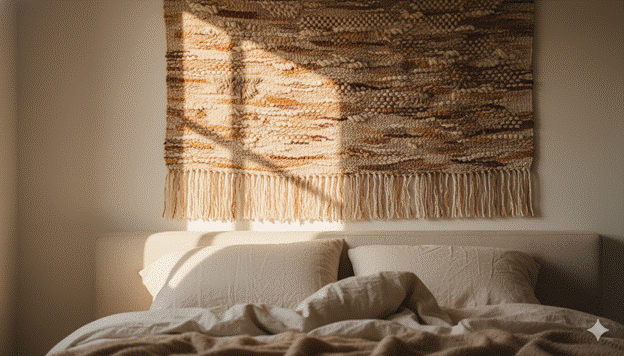 Styling Tip: The most beautiful and most cozy wall hanging placement is one that creates a direct visual and compositional relationship with the furniture below it. A wall hanging hung approximately 20-25cm above the top of a bed headboard, with its width spanning approximately 60-70% of the headboard’s width, creates a perfectly proportioned textile focal point above the bed. A macramé or woven piece hung above a sofa should span at least two-thirds of the sofa’s visual width for the most confident and most resolved compositional result. Choose natural fibres — undyed cotton, natural wool, jute — for the most authentic cozy room decor quality.