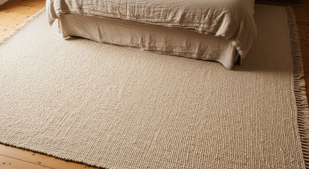 Styling Tip: Choose a rug in a natural fibre — wool, a wool blend, or a quality cotton — in a warm neutral tone or a subtle organic pattern that complements the room’s palette without competing with the bedding or the wall colour. Place a large rug beneath the bed — extending significantly beyond the bed on both sides and at the foot — rather than two small runners on either side. A single generous rug creates a more cohesive, more luxurious, and more architecturally resolved result than two narrow alternatives. The rug should feel genuinely soft underfoot — this is a room in which you walk barefoot every single day.