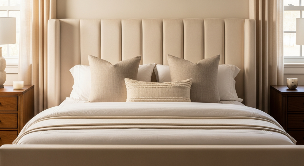 Styling Tip: Build the bedding in three layers for the most luxurious and most visually beautiful result. A quality fitted sheet and flat sheet in washed linen or Egyptian cotton form the base. Add a quilted coverlet or fine cotton blanket as a mid-layer in a complementary tone. Finally, a feather or quality down duvet in a beautiful linen or cotton duvet cover forms the top layer — dressed with four to six cushions in varying textures and a single draped throw at the foot of the bed. Keep the entire bedding palette tonal — warm whites, ivories, and creams — for the most serene and most consistently beautiful chambre parentale aesthetic.