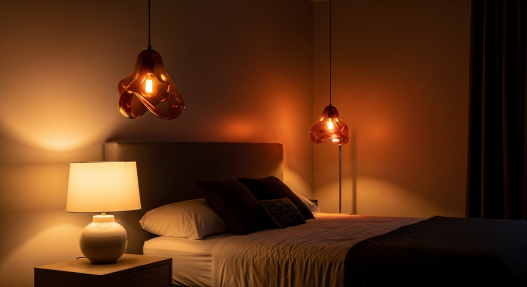 Consider wall-mounted swing-arm bedside lights rather than table lamps if bedside surface space is limited — they provide the same quality of intimate, directional light while freeing the bedside table for books, plants, and personal objects.