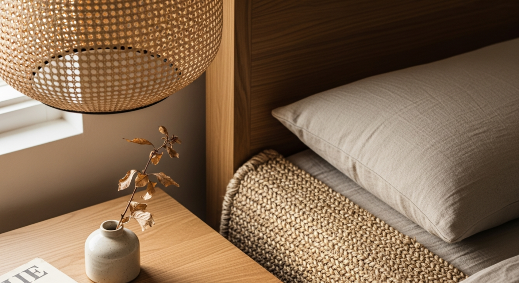 Styling Tip: Introduce natural materials at every scale of the room. At the largest scale — a solid timber bed frame or wooden flooring. At the mid scale — a rattan pendant light, a woven jute bedside rug, a timber bedside table. At the smallest scale — a ceramic lamp base, a stone candle holder, a linen cushion. The accumulation of natural materials across every layer of the room creates a coherent, organic warmth that individual statement pieces alone can never achieve.