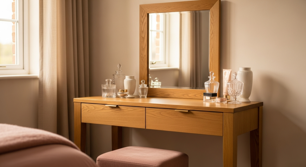 Styling Tip: If space allows, dedicate a corner or wall of the chambre parentale to a quality dressing table in a natural material — solid timber, painted wood, or a marble-topped console — with a beautiful mirror above it. Choose a mirror with a warm, complementary frame — natural timber, brushed gold, or aged brass — that reflects both natural and artificial light back into the room. Add a small upholstered stool in a complementary fabric and arrange the dressing surface with a small selection of quality glass, ceramic, and natural material vessels for beauty essentials.