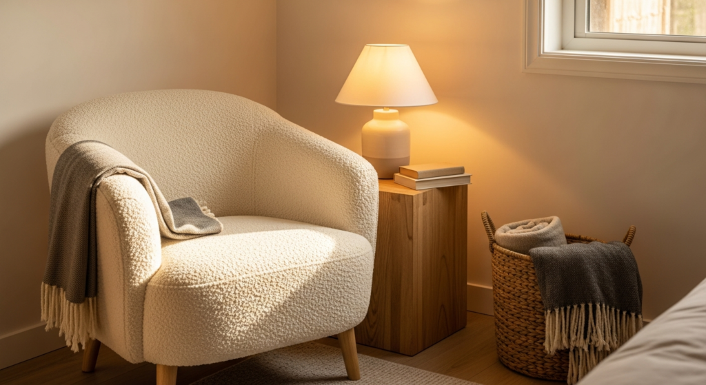 Styling Tip: Create a reading nook in a corner of the chambre parentale with a quality armchair or chaise longue in a complementary fabric — linen, velvet, or bouclé in a warm neutral. Add a small side table for a lamp and a cup of tea, a soft floor-standing lamp for reading light, and a small woven basket or wooden crate for books and blankets. The reading nook should feel slightly separated from the bed — a small area rug in a complementary natural fibre defines the space beautifully and reinforces the sense of a distinct zone within the room.