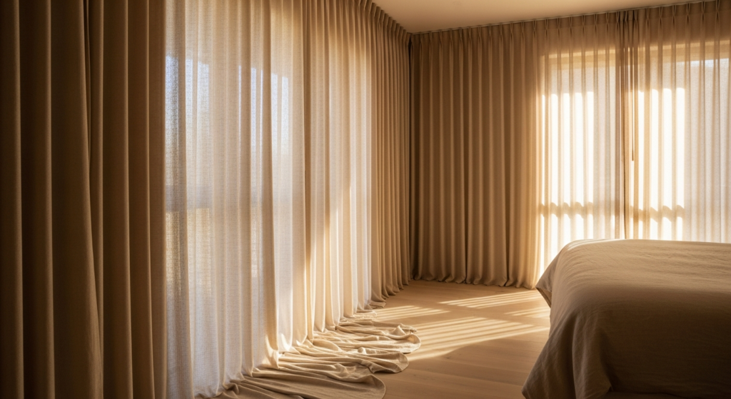 Blackout lining within beautiful sheer or linen curtain panels allows the room to achieve both aesthetic beauty and genuine functional darkness — essential for quality rest regardless of the season or the orientation of the room.